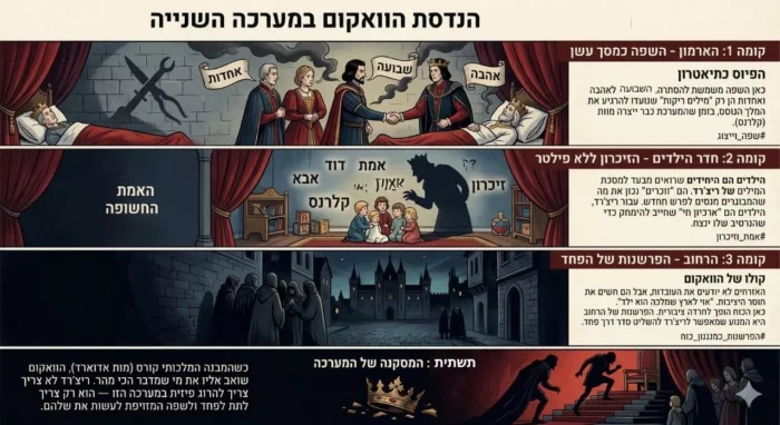 טעות לחשוב שריצ'רד ממציא כאן את הרוע. הרוע כבר מבוצר בתוך מוסדות השלטון, בתוך לשון החצר, בתוך הפער שבין שבועה למעשה. ריצ'רד אינו יוצר את הקרקע הזאת. הוא מזהה עד כמה היא בשלה, ואז דוחף בדיוק אל המקומות שבהם הסדר כבר נחלש. הוואקום איננו רק מצב שהוא מנצל, אלא גם נשק שהוא מרחיב. זו מדינה שבה המילים איבדו את ערכן, והאמת, אם בכלל עוד אפשר לדבר עליה, נגבית במחיר דם.